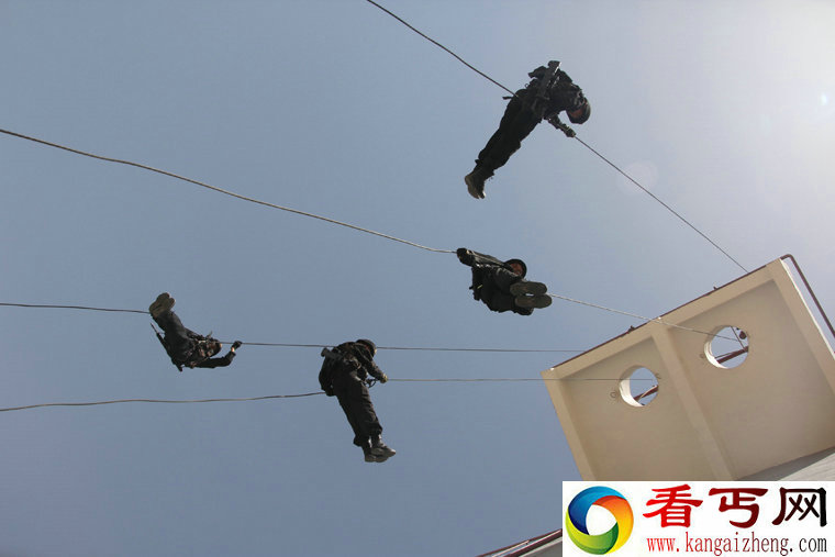 武警新疆总队四支队特勤中队进行楼房索降训练(2014年6月14日摄)