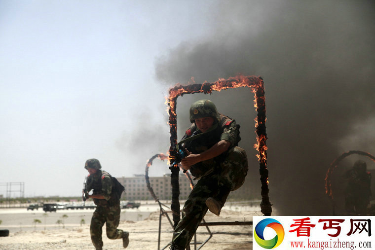 武警新疆总队四支队特勤中队设置实战环境,进行穿越火障训练(2014年6月14日摄)。