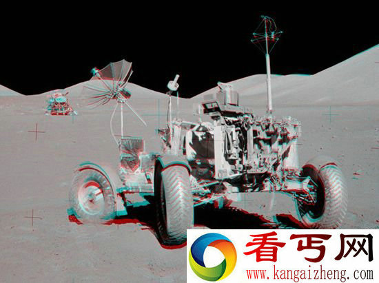 拿出你的红/蓝眼镜,来观赏这张来自月亮.金牛-利特罗峡谷的立体影像吧!这张彩色立体图,清晰地呈现前景阿波罗17号月球车的细緻立体景观,背景则是登月舱和远处的月球山丘。